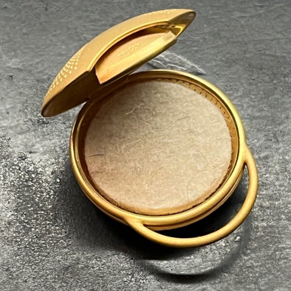 Das Scharnier basiert auf einer Entwicklung des herstellenden Handwerksbetriebs. Das Aufklappen geht leichtgängig und präzise. Das Medaillon lässt sich mit dem Fingernagel an der dafür vorgesehenen Einbuchtung leicht öffnen und mit sanftem Andruck auch wieder sicher verschließen. Ein leicht einschnappender Mechanismus sorgt für sicheren Verschluss.
